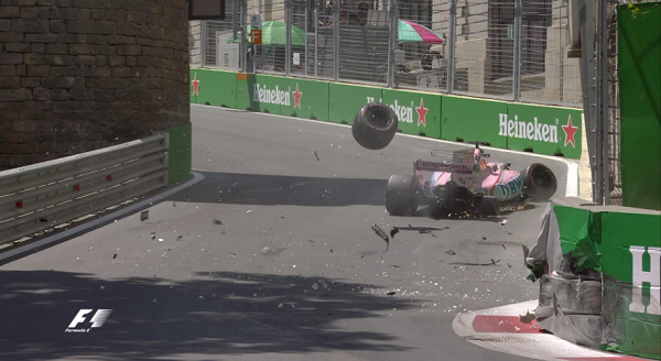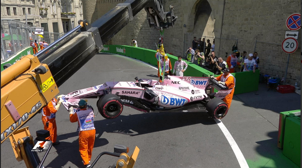 Report-un məlumatına görə, "Force İndia"nın pilotu Serxio Peresin bolidi səkkizinci döngədə - Qız Qalasının yaxınlığında səddə çırpılıb və yarasız hala düşüb. Zərbənin gücündən bolidin sağ arxa təkəri qopub. Pilot bolidi tərk edikdən sonra marşallar ərazidə təmizlik işi aparıblar. Bolidin trassdan götürülməsi üçün kran gətirilib.