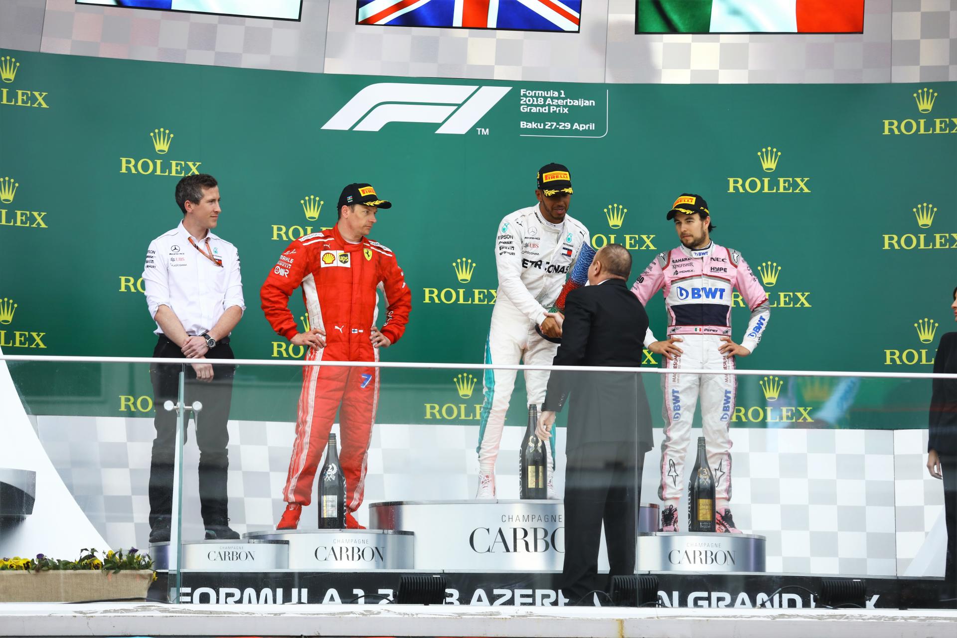 İkinci yerin sahibi, “Ferrari”nin sürücüsü Kimi Raikkonenə kuboku Azərbaycanın gənclər və idman naziri Azad Rəhimov, üçüncü yeri tutan “Force India” komandasının pilotu Serxio Peresə isə kuboku Azərbaycan Avtomobil Federasiyasının prezidenti Anar Ələkbərov təqdim etdilər.