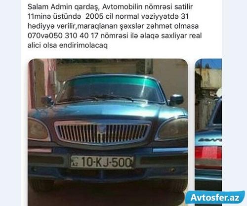 Axar.az Avtosfer.az-ə istinadən xəbər verir ki, elanı göndərən şəxs 10 KJ 500 dövlət nömrə nişanını 11000 manata satdığını, onu alacaq şəxsə nömrənin üstündə 2005-ci ilin QAZ-31-ini hədiyyə edəcəyini yazıb.