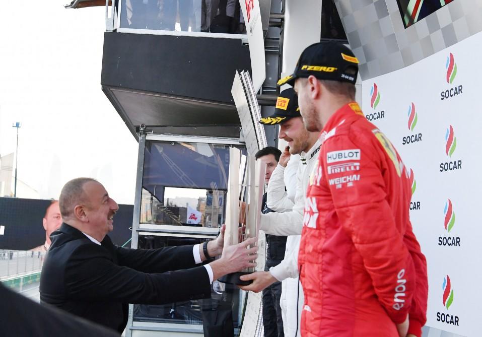 Qran-Prinin qalibi Valtteri Bottasa kuboku Azərbaycan Respublikasının Prezidenti İlham Əliyev təqdim etdi.