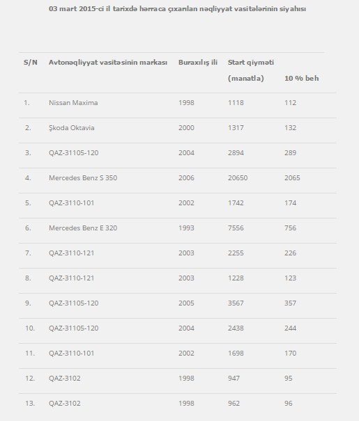 Axar.az xəbər verir ki, komitə hərraca çıxarılacaq nəqliyyat