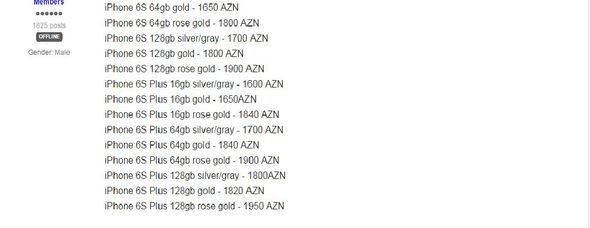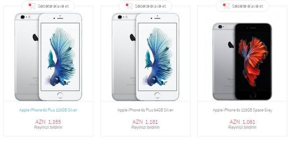 Məlumata əsasən, Disput.az sosial şəbəkəsində Ayfon 6s 16gb - 1300 AZN, Ayfon 6 64gb - 1400 AZN, Ayfon 6S - 128gb 1700 AZN, Ayfon 6S Plus 16gb - 1600 AZN, Ayfon 6S Plus 64gb - 1700 AZN, Ayfon 6S Plus 128gb 1800 AZN-ə satılır.