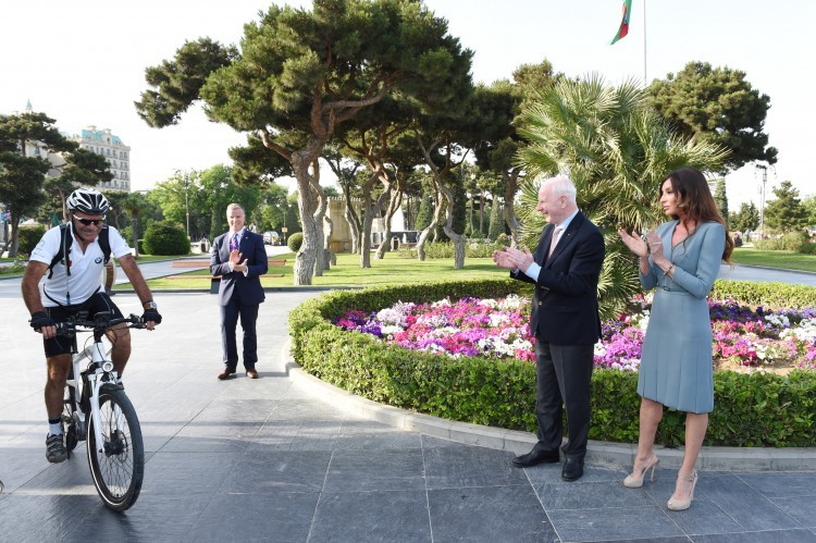 xanımı Mehriban Əliyeva velosipedçiyə ailə üzvləri ilə birlikdə