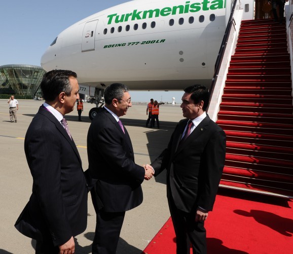 Axar.az xəbər verir ki, hər iki ölkənin dövlət bayraqlarının dalğalandığı Heydər Əliyev Beynəlxalq Aeroportunda Türkmənistan Prezidentini Azərbaycan Respublikası xarici işlər nazirinin müavini Xələf Xələfov və Bakı-2015 Avropa Oyunları Əməliyyat Komitəsinin nümayəndələri qarşılayıblar.