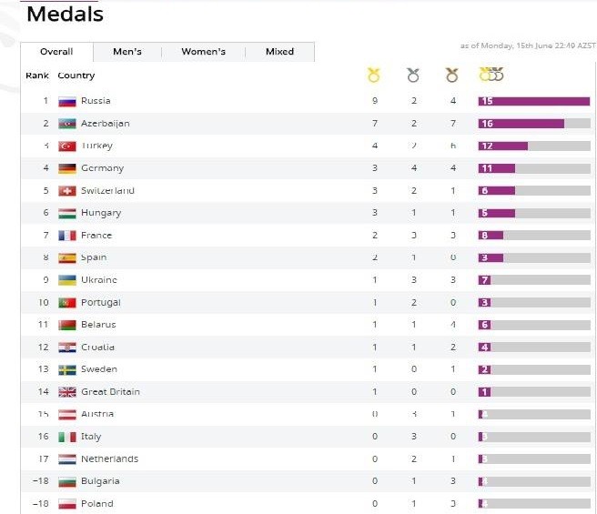 Axar.az xəbər verir ki, komandamız ən çox medal qazanan ölkələr