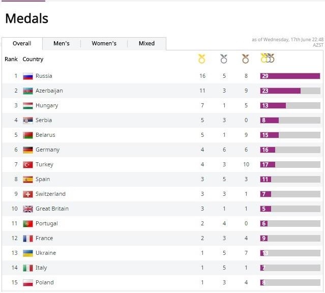 qızıl, 5 gümüş, 8 bürünc medalı var. İlk üçlükdə olan Macarıstan 7