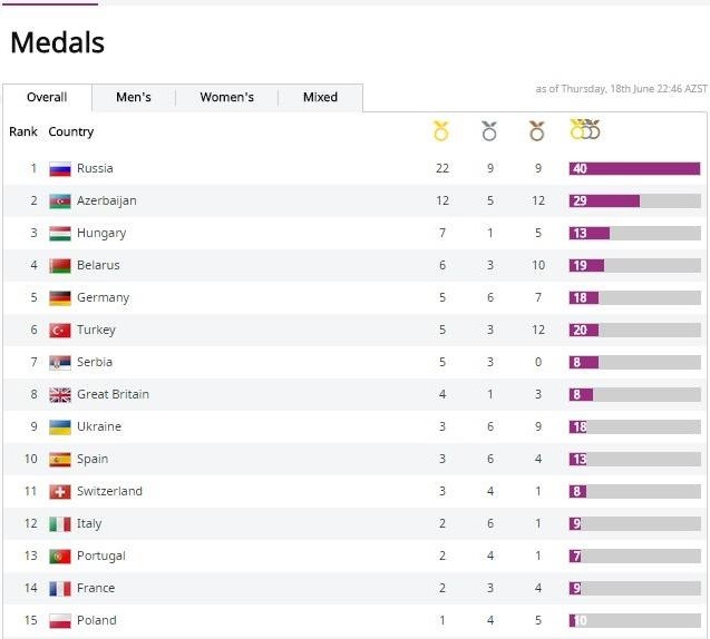 var. İlk üçlükdə olan Macarıstan 7 qızıl, 1 gümüş, 5 bürünc medala