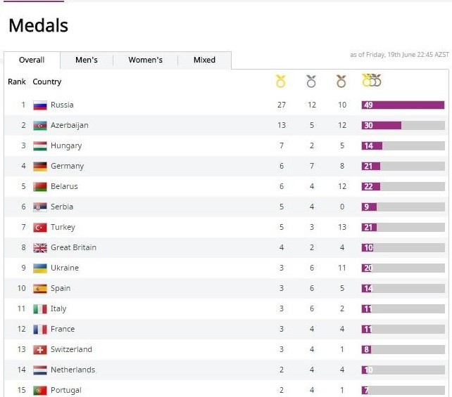 Axar.az xəbər verir ki, medal siyahısında Rusiya millisi