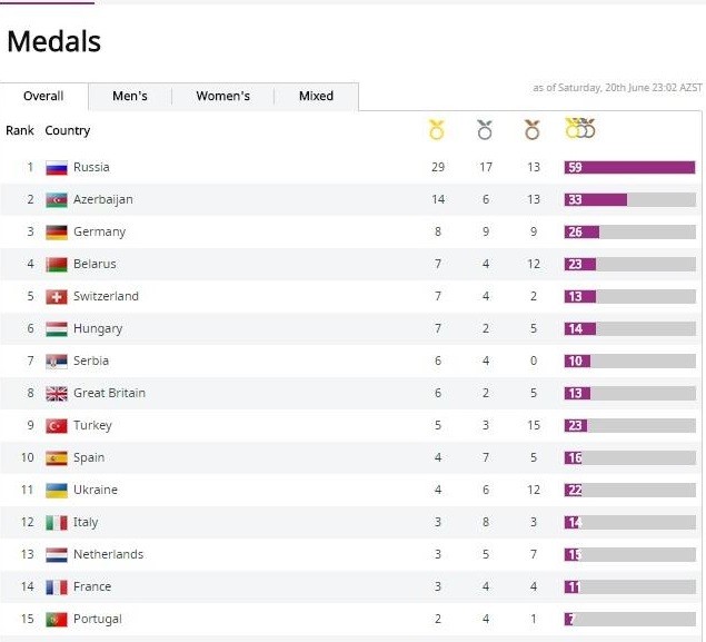 Siyahıda 2-ci olan Azərbaycan 14 qızıl, 6 gümüş, 13 bürüncə