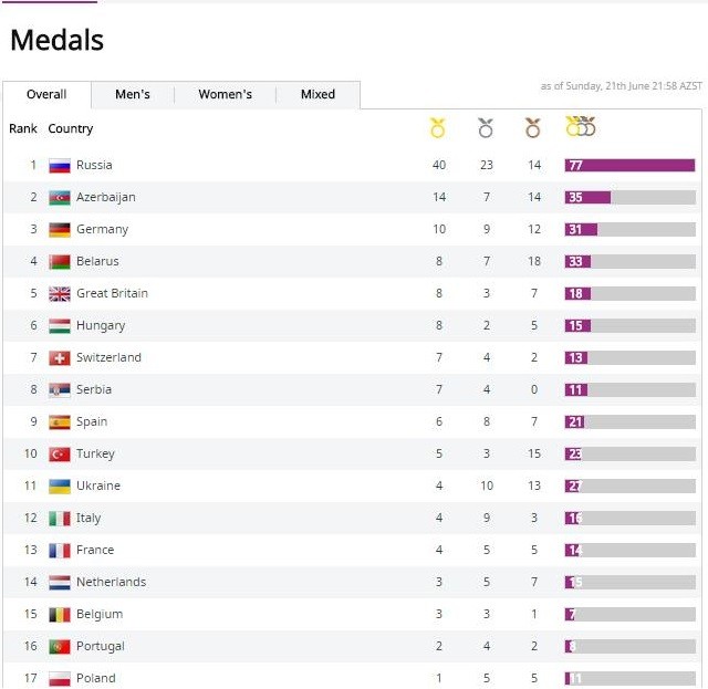 Siyahıda 2-ci olan Azərbaycan 14 qızıl, 7 gümüş, 14 bürüncə