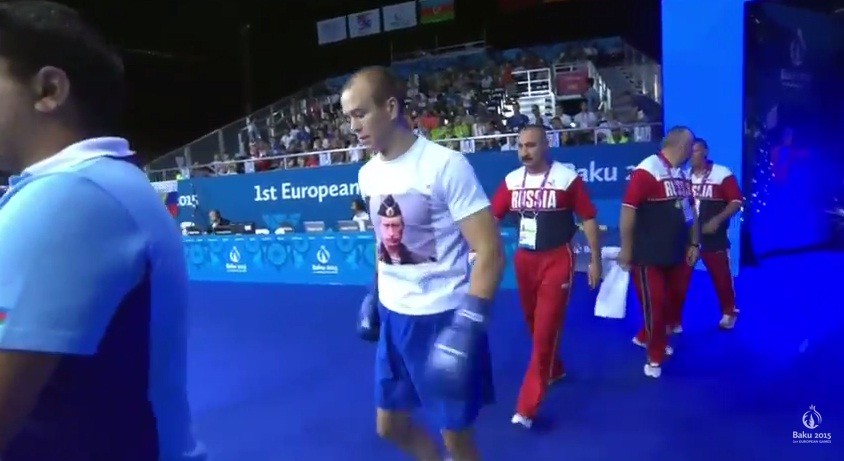 Rusiyalı idmançı görüşə ön hissəsində prezident Vladimir Putinin şəkli olan köynəklə gəlib.