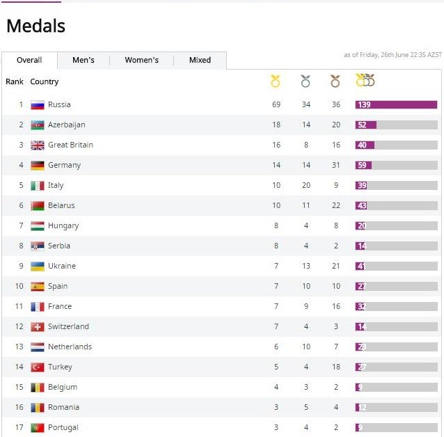 var. Siyahıda 2-ci olan Azərbaycan 18 qızıl, 14 gümüş, 20 bürüncə