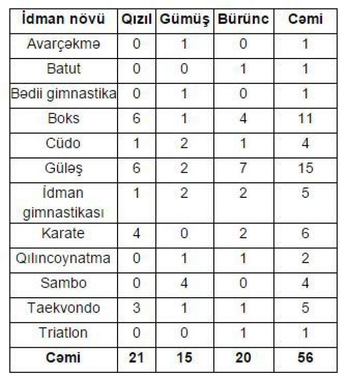 Qeyd: idman növləri əlifba sırası ilə düzülüb.b