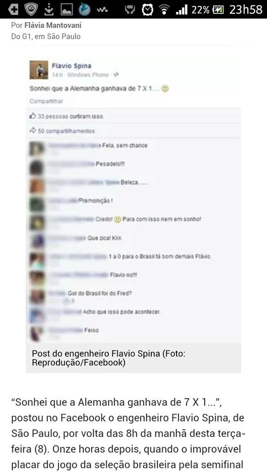 Braziliyanın San Paulo şəhərində yaşayan Flavio Spina adlı bir mühəndis dünən keçirilən və 1:7 hesabı ilə bitən Braziliya-Almaniya qarşılaşmasının hesabını bir gün əvvəl yuxusunda görüb.