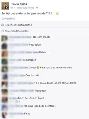 Axar.az xəbər verir ki, Spina matçdan 14 saat əvvəl Feysbuk hesabından yazdığı şərhdə yuxusunda Almaniyanın Braziliyanı 7-1 hesabı ilə udacağını yazıb.