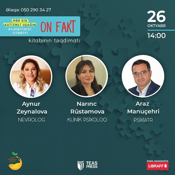 Oktyabrın 26-sı saat 14:00-da "Elmlər Akademiyası" metrosu ilə üzbəüz yerləşən “Libraff” kitab mağazasında “Hər bir autizmli uşağın bilməyinizi istədiyi on fakt” kitabının təqdimat mərasimi keçiriləcək.