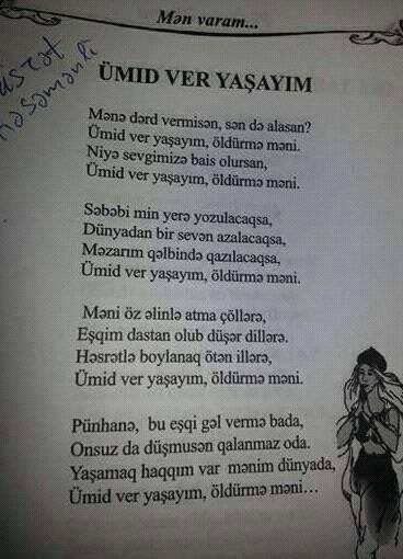 "Pünhanə Əliyeva adlı bir xanım "Mən varam" adlı kitab çap etdirib. Kitabda atama və Məmməd Araza aid bir neçə şeir var. Bircə kəlməsini belə dəyişmədən o şeirləri verib. O boyda böyük şairlərin şeirlərini hansı haqla mənimsəmək, öz adından təqdim etmək olar? Mənə maraqlıdır ki, bu qadın bu qədər səhv edib. Onun kitabının arxasında yazılıb ki, "Qızıl Qələm" mükafatçısıdır. Yaxşı, o səhv edib, bəs ona bu mükafatı verən şairlər, yazarlar görmürlər ki, bu şeirlərin müəllifi kimdir?"