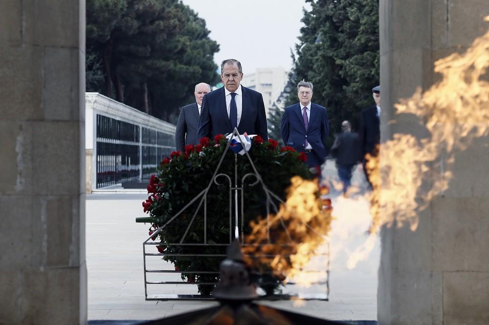 Axar.az xəbər verir ki, TASS agentliyinin fotomüxbiri Aleksandr Şerbakın çəkdiyi bu fotoşəkildə Rusiyanın Xarici İşlər naziri Sergey Lavrov, stats-sekretar – Xarici İşlər nazirinin müavini Qriqori Karasin və Rusiyanın Azərbaycandakı səfiri Vladimir Doroxin tərəfindən Bakıdakı Şəhidlər Xiyabanında “Əbədi məşəl” memorialı önünə əklil qoyulması anı əks olunub.