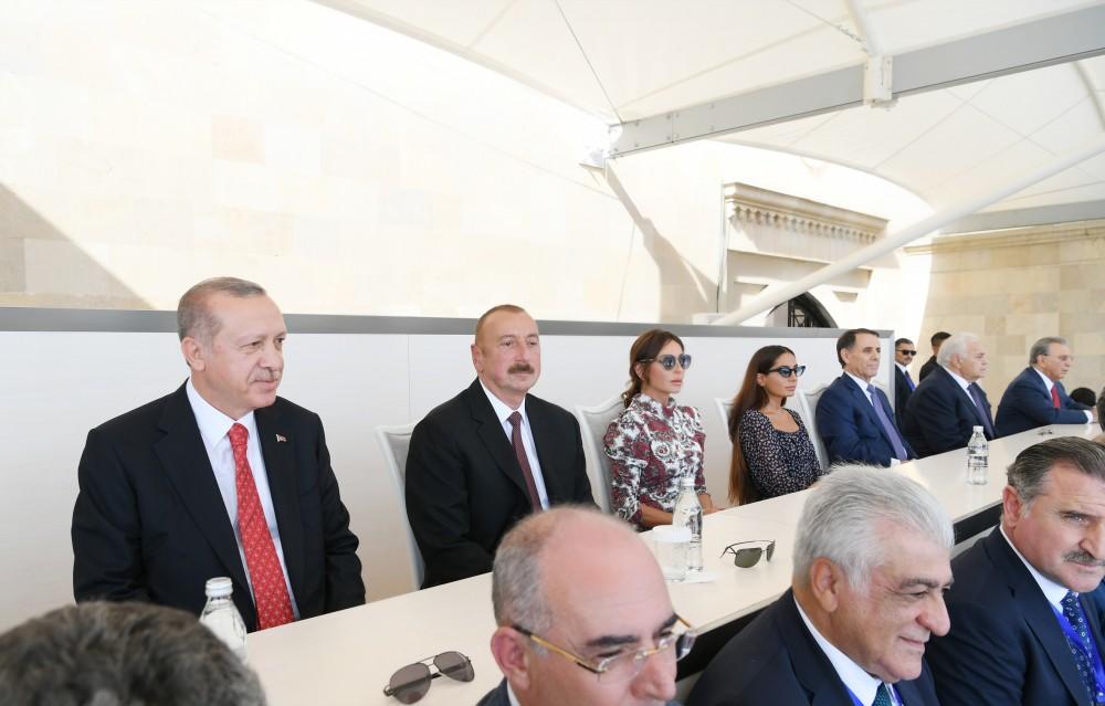 Axar.az xəbər verir ki, Azərbaycan Respublikasının Prezidenti İlham Əliyev, Türkiyə Respublikasının Prezidenti Rəcəb Tayyib Ərdoğan və Azərbaycanın birinci xanımı Mehriban Əliyeva paradda iştirak ediblər.