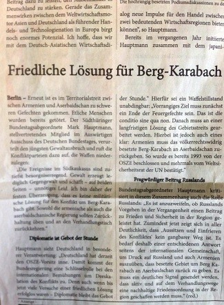 Axar.az xəbər verir ki, məqalədə Almaniya Bundestaqının deputatı Mark Hauptmanın Ermənistan-Azərbaycan münaqişəsinin həllinə dair fikirləri yer alıb. Münaqişə tərəflərini sülh yolu ilə həllə sadiq qalmağa çağıran almaniyalı deputat davamlı həll üçün işğala son qoyulmasının vacibliyini qeyd edir: "Ermənistan beynəlxalq hüquqa zidd olaraq işğal etdiyi Dağlıq Qarabağı Azərbaycana geri qaytarmalıdır. Bu haqda hələ 1993-cü ildə ATƏT və BMT-nin Təhlükəsizlik Şurası qərarlar qəbul edib".