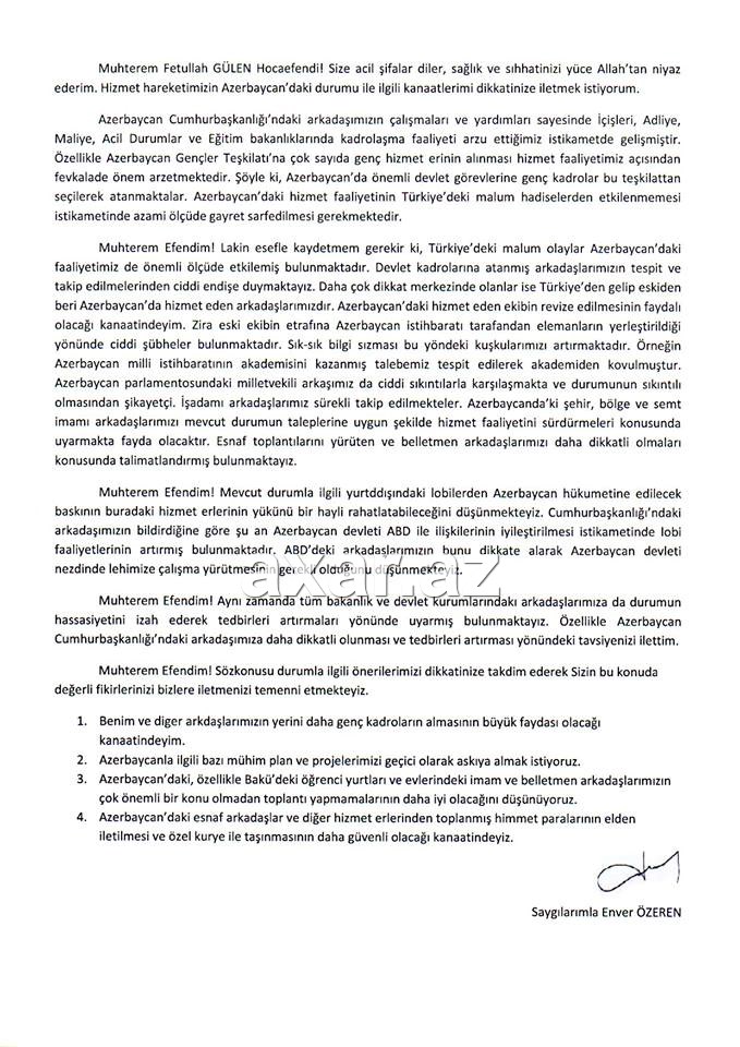 Məktubda Fətullah Gülənə müraciət edən Ənvər Özərən Prezident