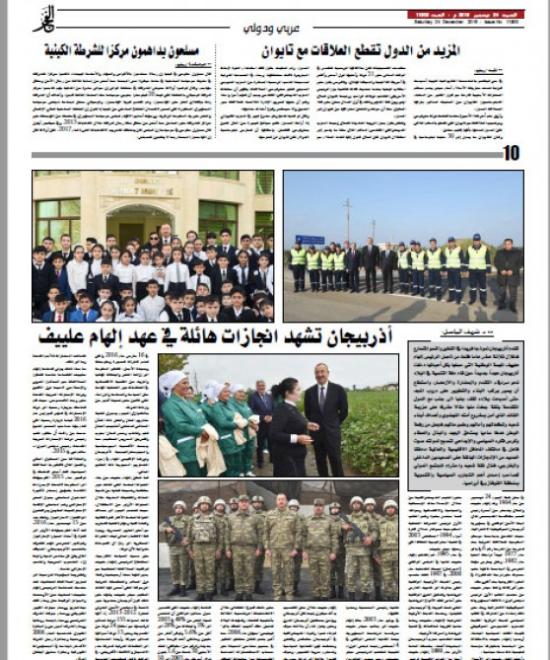 Birləşmiş Ərəb Əmirliklərinin (BƏƏ) geniş oxucu auditoriyasına malik “Əl-Fəcr” qəzetində baş redaktor Şəfir Əl-Bəsilin Prezident İlham Əliyevin rəhbərliyi ilə Azərbaycanın əldə etdiyi nailiyyətlərə həsr olunan məqaləsi dərc edilib.
