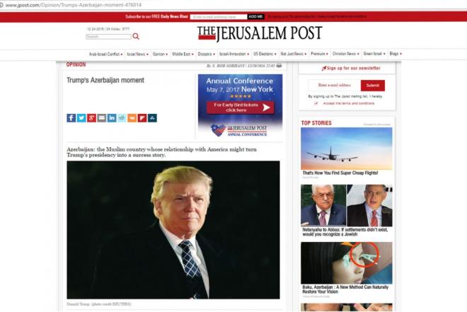 İsrailin nüfuzlu “Yerusalim Post” qəzetində ABŞ-ın “Caspian Group Holdings” şirkətinin baş direktoru Rob Sobhaninin “Trampın Azərbaycan anı” sərlövhəli məqaləsi dərc olunub.