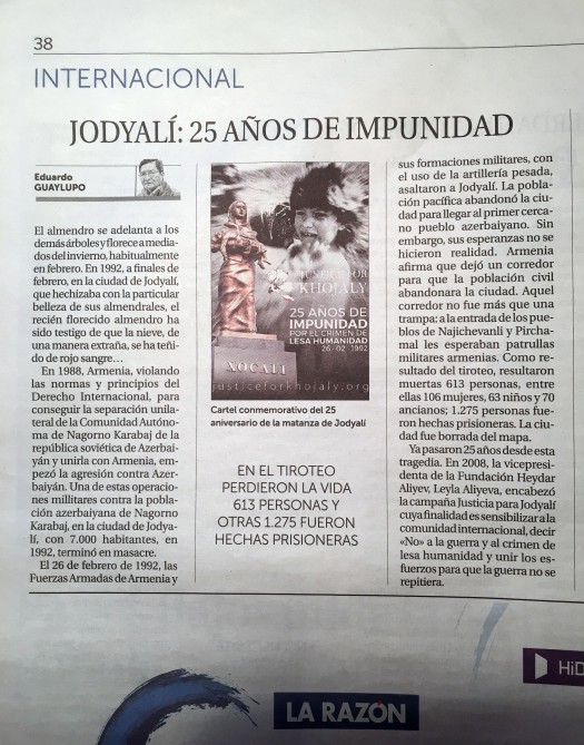 İspaniyanın “La Razon” qəzetində Xocalı soyqırımının 25-ci ildönümü ilə bağlı “Xocalı: 25 il cəzasızlıq” adlı məqalə dərc edilib. Eduardo Guayluponun müəllifi olduğu məqalədə 25 il əvvəl Xocalıda törədilmiş qırğın nəticəsində 613 nəfərin qətlə yetirildiyi, 1275 nəfərin əsir götürüldüyü vurğulanır.