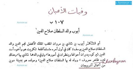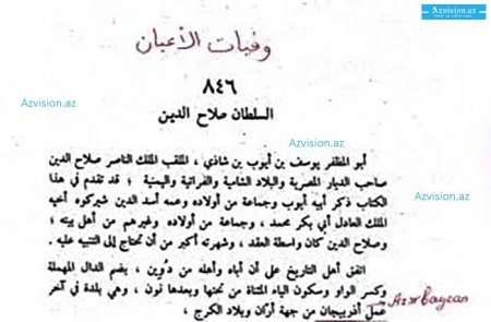 Halbuki onların göstərdiyi bu mənbələrdə Səlahəddin Əyyubinin azərbaycanlı olması qeyd olunub. Hətta İbn Xallikan, Səlahəddin Əyyubi başda olmaqla Əyyubilərin Azərbaycanın şimalında yerləşən Duvin şəhərindən olduğu haqda tarixçilərin yekdil rəy verdiklərini qeyd edir. Bundan əlavə Səlahəddin Əyyubi ilə bağlı oxuduğum əsərlərdə, Misiri işğaldan azad edilməsi zamanı ermənilərin ona qarşı müharibə etdiyini, Səlahəddinin isə qələbə çalaraq onları darmadağın etdiyi barədə xəbərlərə rast gəldim.