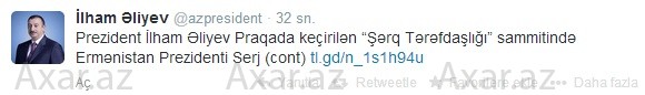 Azərbaycan prezidenti İlham Əliyev rəsmi Tvitter hesabında Praqada keçirilən "Şərq Tərəfdaşlığı" sammitində Ermənistan Prezidenti Serj Sarkisyanın Türkiyə əleyhinə səsləndirdiyi fikirlərə verdiyi cavabı paylaşıb.