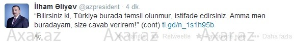"Axar.az" xəbər verir ki, İlham Əliyev, "Bilirsiniz ki, Türkiyə burada təmsil olunmur, istifadə edirsiniz. Amma mən buradayam, sizə cavab verirəm!" yazıb.