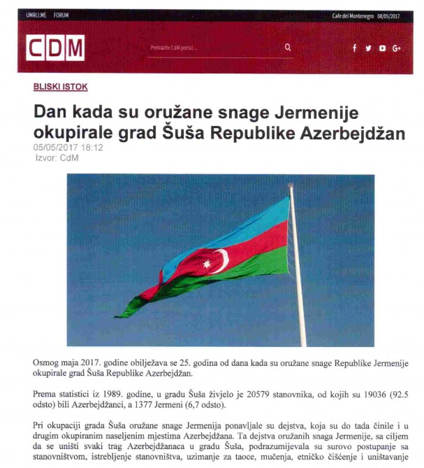 Monteneqronun geniş oxucu auditoriyasına malik cdm.me portalında “Ermənistan silahlı qüvvələrinin Azərbaycan Respublikasının Şuşa şəhərini işğal etdiyi gün” adlı məqalə yayılıb.