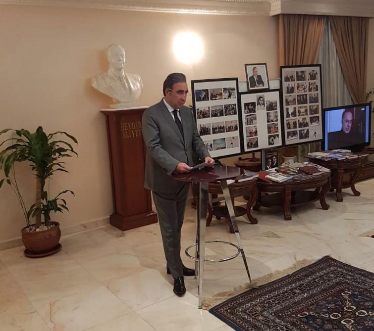 Mərasimi açan səfir Elxan Qəhrəman müasir müstəqil dövlətimizin qurucusu, dünya şöhrətli siyasi xadim Heydər Əliyevin xalqımız qarşısındakı xidmətlərindən danışıb. Qeyd edib ki, ümummilli lider Heydər Əliyev tarixin yetirdiyi dahi şəxsiyyətlərdən biridir. Bu böyük şəxsiyyət Azərbaycan xalqının yaddaşında qurucu və xilaskar dövlət xadimi, milli lider və xalq məhəbbətini qazanan öndər kimi qalıb. Kəşməkəşli həyat yolu keçmiş Heydər Əliyev hansı vəzifədə işləməsindən asılı olmayaraq daim xalqını düşünür, onun problemlərinin həllində prinsipial mübarizə aparırdı. Ulu Öndərin əvəzsiz xidmətləri nəticəsində Azərbaycan dünyanın nüfuzlu dövlətlərindən birinə və bölgədə lider dövlətə çevrilib. Təməli Ulu Öndər tərəfindən qoyulmuş daxili və xarici siyasət Prezident İlham Əliyev tərəfindən uğurla davam etdirilir və xalqımız onun rəhbərliyi ilə demokratiya, sülh və tərəqqi yolu ilə irəliləyir.