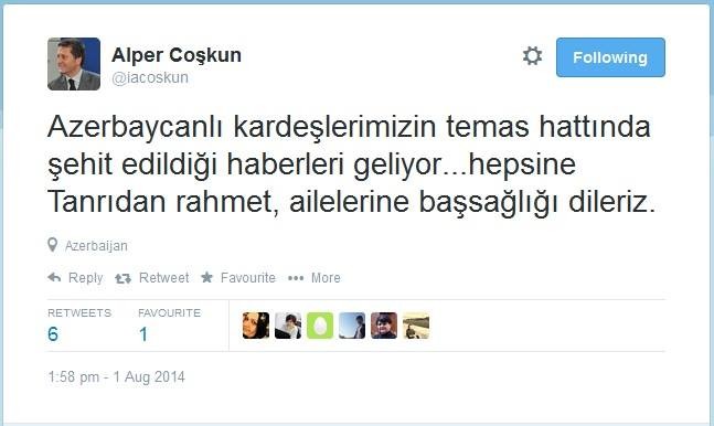 Axar.az xəbər verir ki, bununla bağlı Türkiyənin ölkəmizdəki səlahiyyətli və fövqəladə səfiri İsmayıl Alper Coşqun Azərbaycana başsağlığı verib.