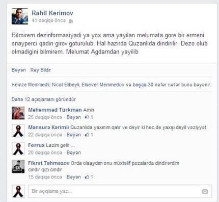Feysbuk sosial şəbəkəsində cəbhə bölgəsində bir erməni qadın snayperin girov götürüldüyü haqda məlumat yayılıb.