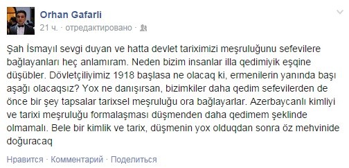 Axar.az xəbər verir ki, bu açıqlama ilə öz Feysbuk səhifəsində Türkiyədə yaşayan azərbaycanlı politoloq Orxan Qafarlı çıxış edib.