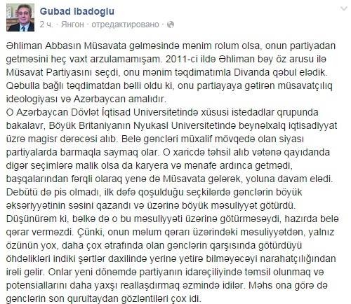 İbadoğlu öz Feysbuk səhifəsində çıxış edib. O, Əhliman Abbasın belə
