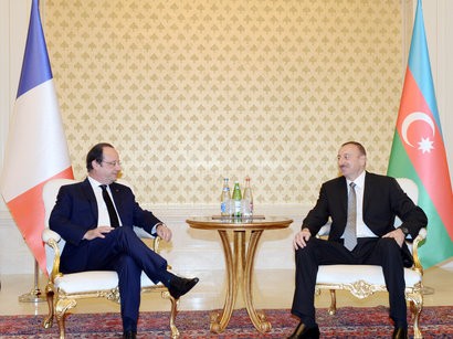 Fransa Prezidenti Fransua Olland Azərbaycan Prezidenti İlham Əliyevi Parisdə Yelisey Sarayında qarşılayıb.