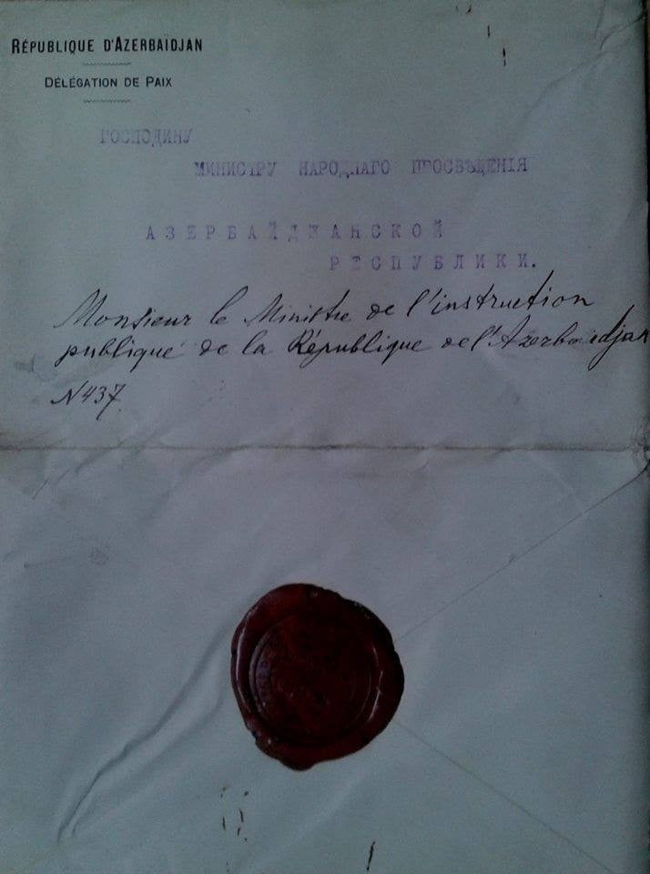 maarif nazirinə ünvanlayıb. Onu yazaraq zərfə qoyub və ağzını