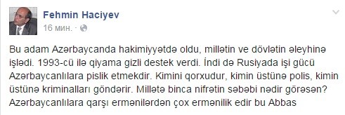"Bu adam Azərbaycanda hakimiyyətdə oldu, millətin və dövlətin əleyhinə işlədi. 1993-cü ildəki qiyama gizli dəstək verdi. İndi də Rusiyada işi-gücü azərbaycanlılara pislik etməkdir. Kimini qorxudur, kiminin üstünə polis, kiminin üstünə kriminalları göndərir. Görəsən, millətə bunca nifrətin səbəbi nədir? Bu Abbas Abbasov azərbaycanlılara qarşı ermənilərdən çox ermənilik edir".