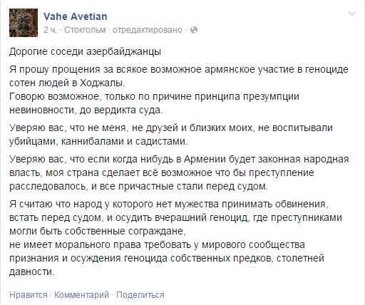 publisist Vahe Avetiya öz Feysbuk səhifəsində çıxış edib.