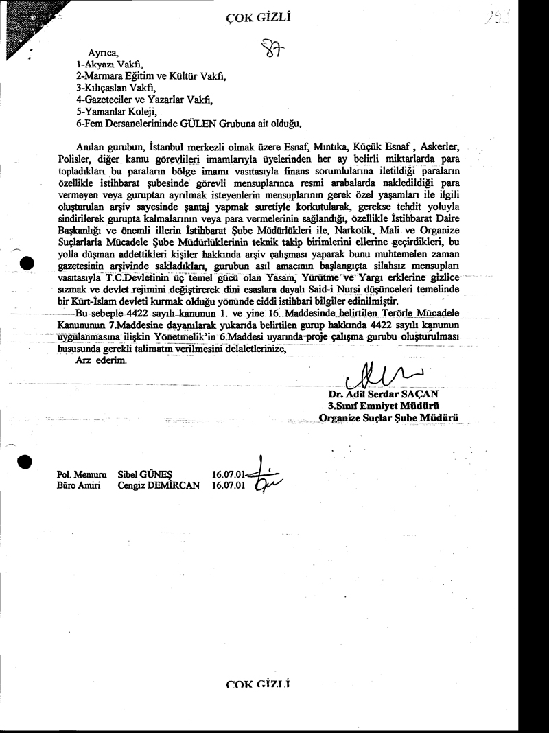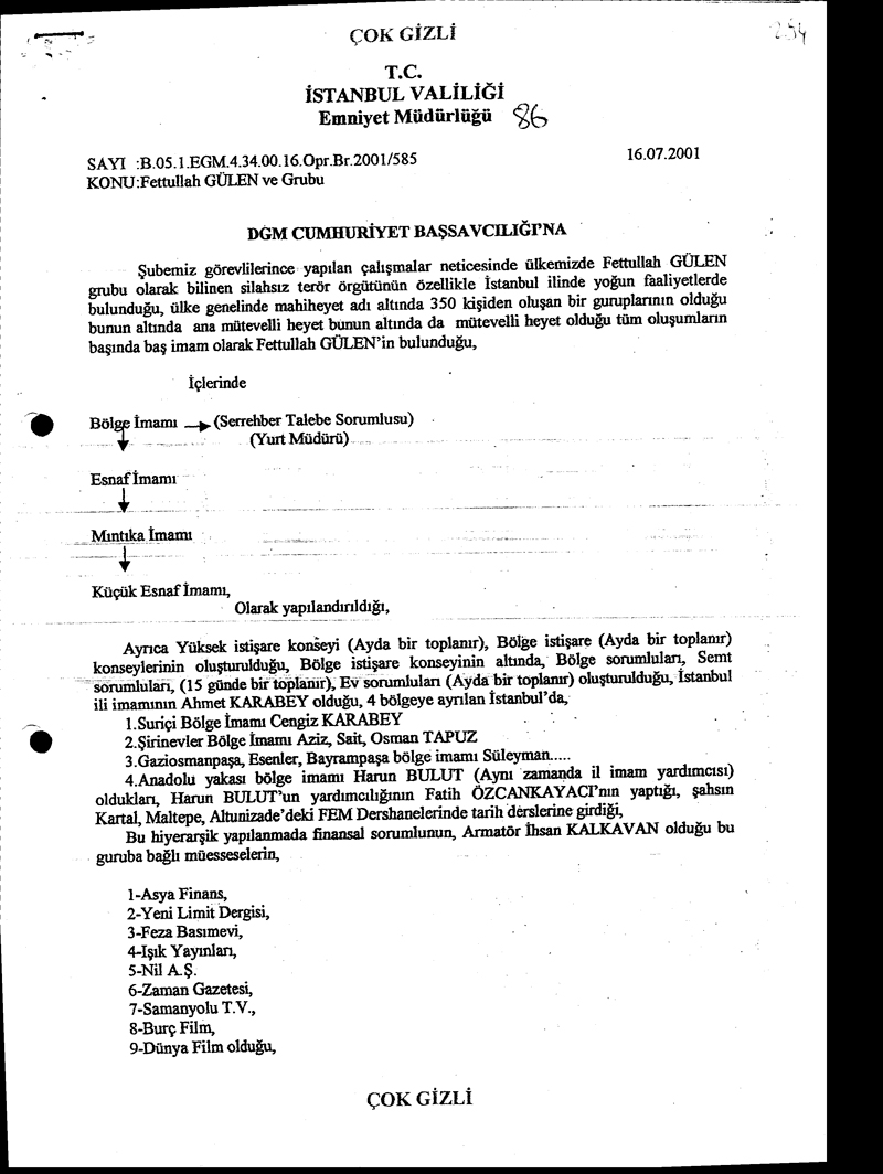 Mətbuatda sənəd Ərdoğanın "camaata (nurçulara) qarşı əməliyyatlar keçirəcəyik" deməsindən sonra ortaya çıxıb. Burada Fətullah Gülən və qrupunun düşmən saydıqları adamlar haqqında arxiv yaradıb, ondan şantaj kimi istifadə etdikləri, eləcə də maliyyə və kəşfiyyat şöbələrinə adamlarını yerləşdirərək vacib şəxsləri dinlədikləri bildirilib.