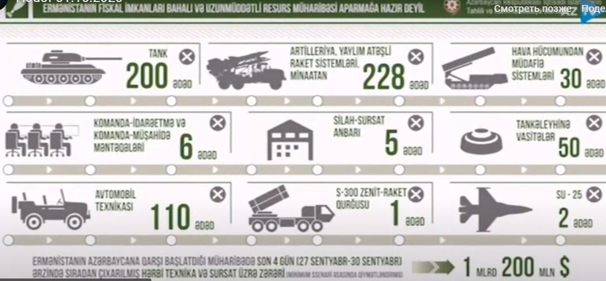İlk 4 gün ərzində Ermənistan ordusunun itirdiyi döyüş texnikasının dəyəri 1.2 milyard dollara bərabərdir.