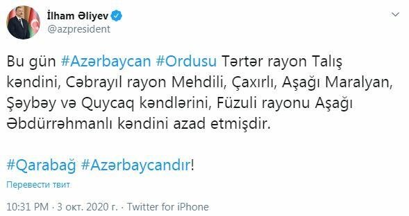 "Bu gün Azərbaycan Ordusu Tərtər rayonu Talış kəndi, Cəbrayıl rayon Mehdili, Çaxırlı, Aşağı Maralyan, Şəybəy və Quyacıq kəndləri, Füzuli rayonu Aşağı Əbdürrəhmanlı kəndini işğaldan azad edib. Qarabağ Azərbaycandır!"