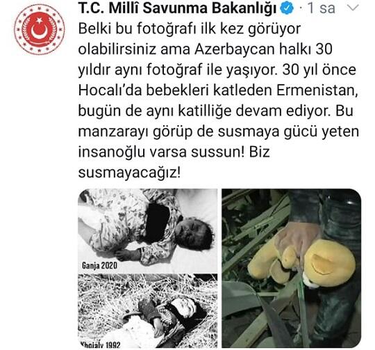 Türkiyə Müdafiə Nazirliyi Xocalı soyqırımı və Gəncədə baş verən terror aktı zamanı qətlə yetirilən körpələrin şəkillərini paylaşaraq, Ermənistanın mülki vətəndaşlarımıza qarşı təxribatına susmayacaqlarını bildirib.