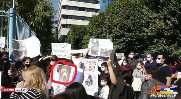 Axar.az BakuPost-a istinadən xəbər verir ki, ermənilər bu gün keçirdikləri mitinq zamanı guya Azərbaycan silahlı qüvvələri tərəfindən dinc əhaliyə, mülki insanlara qarşı zorakılıq tətbiq edilməsinə etiraz ediblər. İddianın absurdluğu bir yana, mitinqdə istifadə olunan fotolardan biri xüsusi diqqət çəkir.