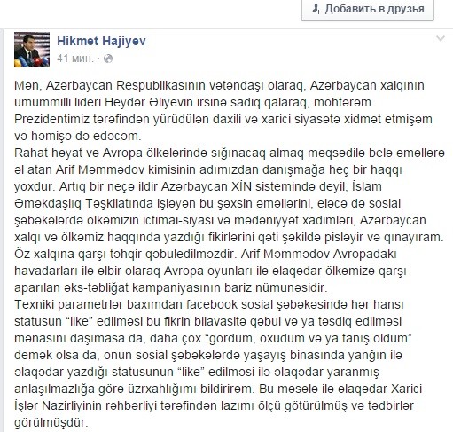 Hikmət Hacıyev, Azərbaycan Respublikasının vətəndaşı".