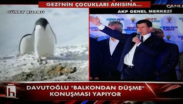 Axar.az xəbər verir ki, kanal Davudoğlunun "Balkon çıxışı" zamanı ekranın sol tərəfinə pinqvinlərdən bəhs edən sənədli film yerləşdirib.