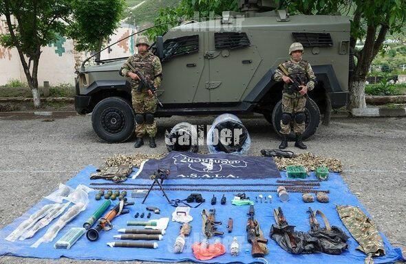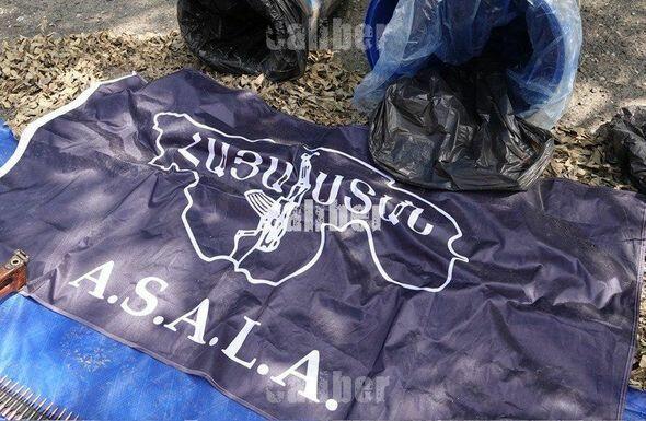 Kamuflyaj toru ilə örtülmüş anbarda olan çəlləklərin birində ASALA terror təşkilatının bayrağı və müəyyən miqdarda psixotrop həblər də tapılıb.