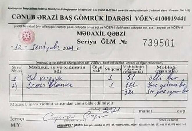 - Yaxud ümumiyyətlə gömrük işi qurulmayıb, lakin İran maşınlarından dövlət rüsumun alınması qarşılığında verilən qəbzlər Cənub Ərazi Baş Gömrük İdarəsinə aiddir.